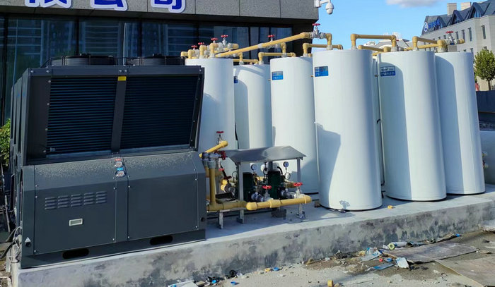 浙江温州玉环市方舱医院午夜性爱福利热泵午夜成人AVAPP采用了速热承压热水系统(ZN-KFDX-100Ⅱ+455L)。主要设备有:4台10匹午夜精品在线视频观看午夜性爱福利热水机(ZN-KFDX-100Ⅱ)+20个455L承压水箱(内胆304不锈钢,外胆201不锈钢,保温厚度50MM)