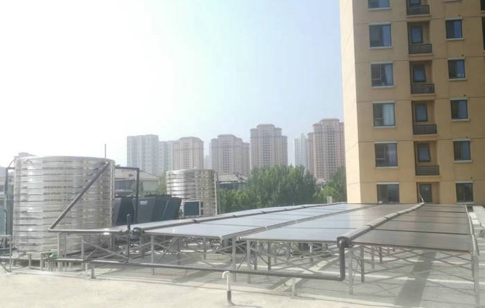 河北一酒店热水项目采用了太阳能+午夜性爱福利热水系统。16组太阳能集热器+2台15匹午夜精品在线视频观看午夜性爱福利热水机(ZN-DKFDX-150ll)+两个8吨圆形不锈钢保温水箱。